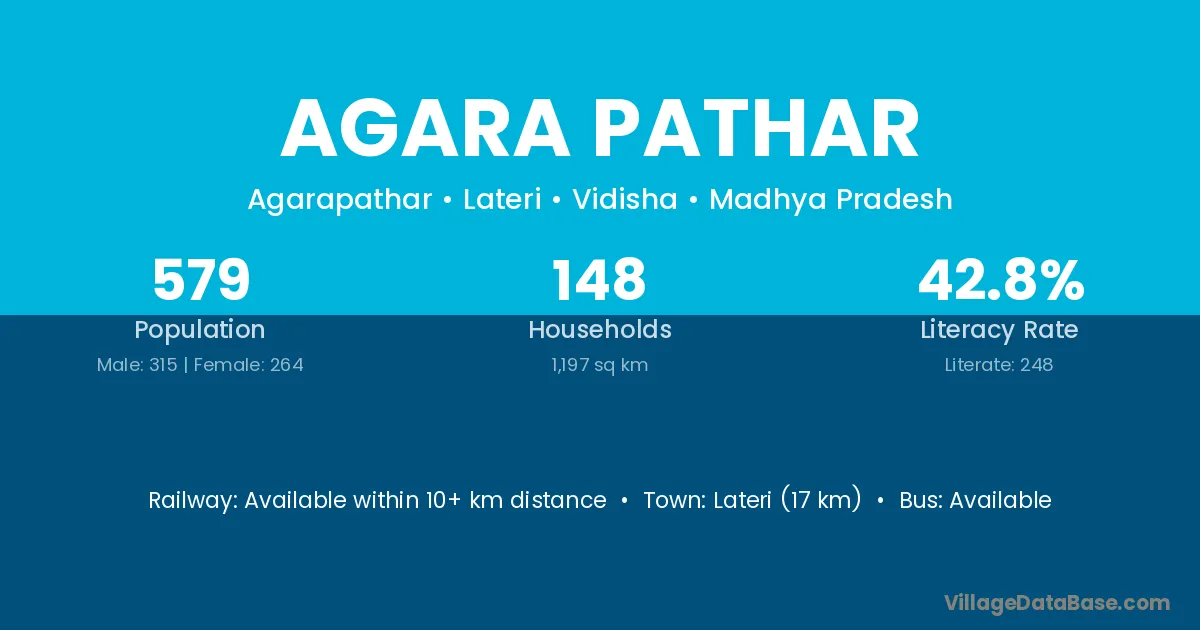 Lateri (17 km) is the nearest town to Agara Pathar village for major economic activities and is located approximately 17 km away.