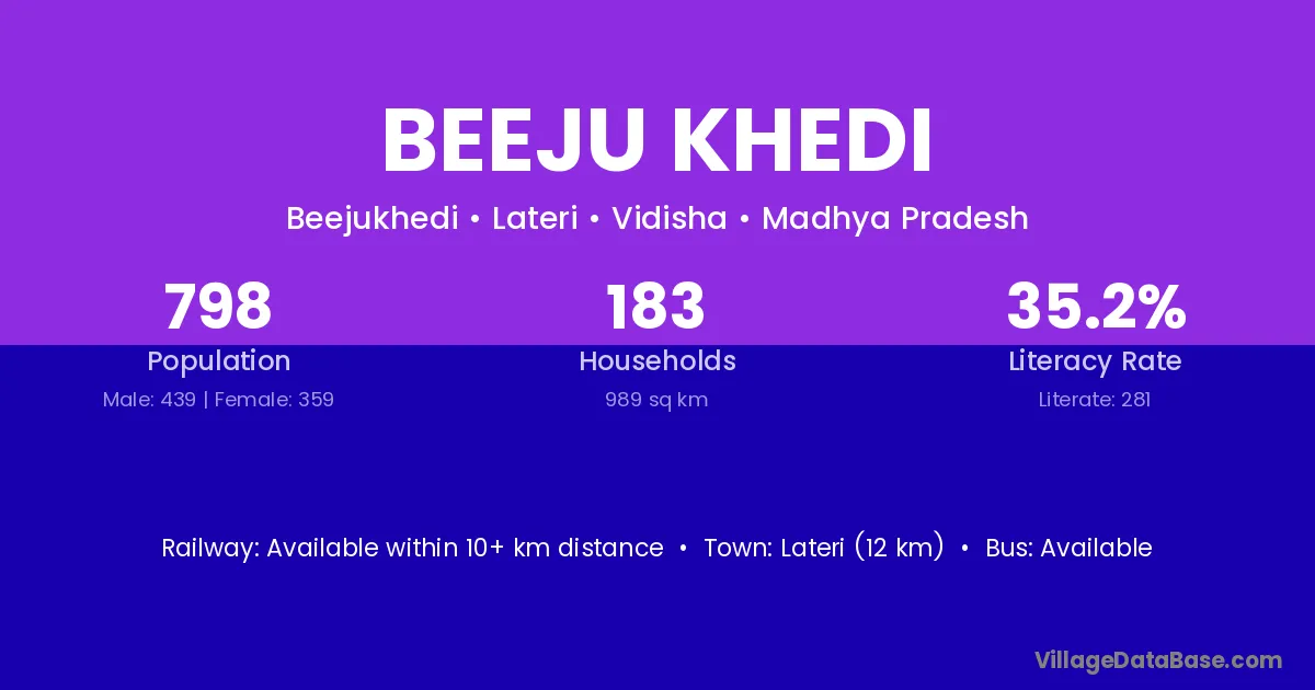 Lateri (12 km) is the nearest town to Beeju Khedi village for major economic activities and is located approximately 12 km away.