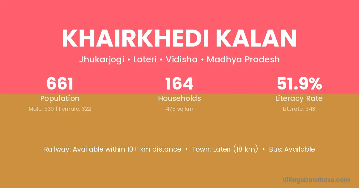 Khairkhedi Kalan village has a total population of 661 people, of which 339 are males and 322 are females.