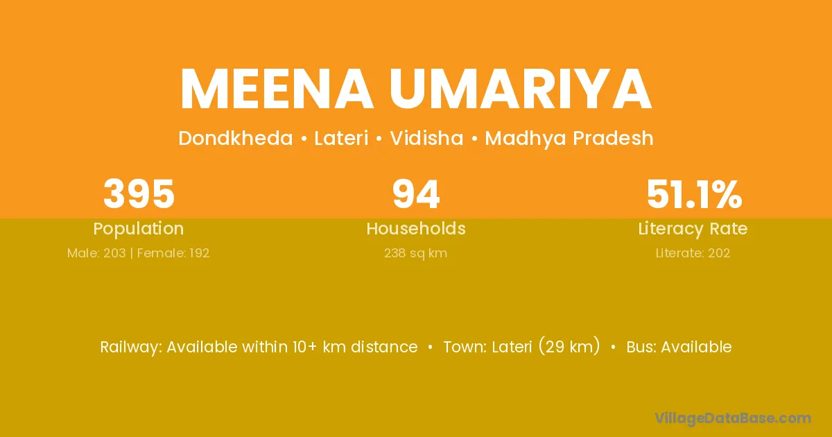 Lateri (29 km) is the nearest town to Meena Umariya village for major economic activities and is located approximately 29 km away.