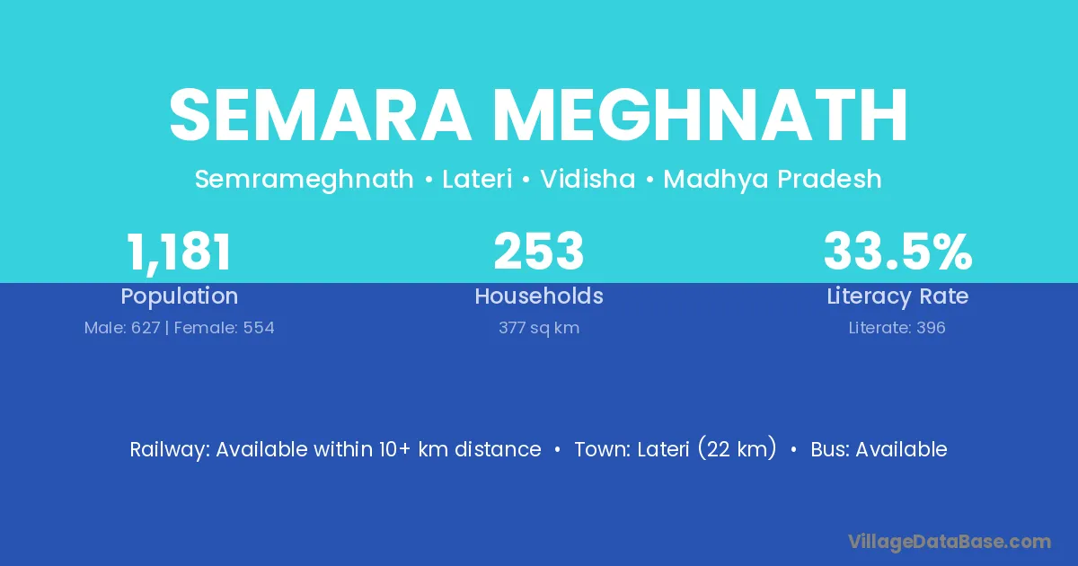 Lateri (22 km) is the nearest town to Semara Meghnath village for major economic activities and is located approximately 22 km away.