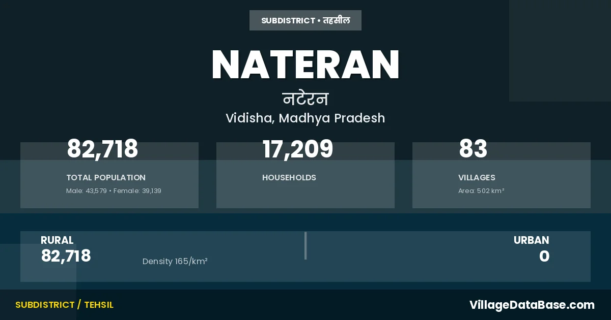 Nateran is a town and Tehsil in the Vidisha district of the Madhya Pradesh. In India, a Tehsil is a subdivision of a district responsible for the administration and revenue collection of a specific area within the district. Tehsils play a crucial role in the local governance structure, contributing significantly to the development and administration of their communities.