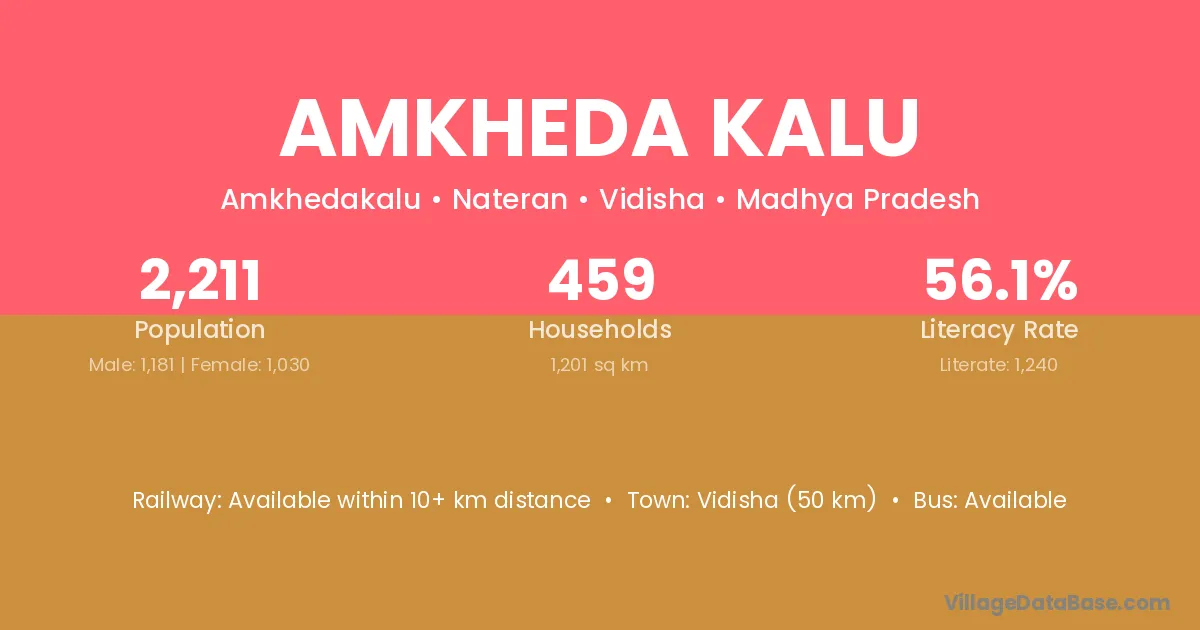 Vidisha (50 km) is the nearest town to Amkheda Kalu village for major economic activities and is located approximately 50 km away.
