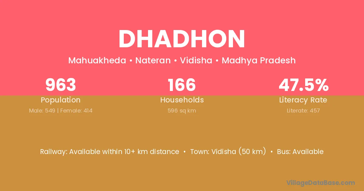 Vidisha (50 km) is the nearest town to Dhadhon village for major economic activities and is located approximately 50 km away.