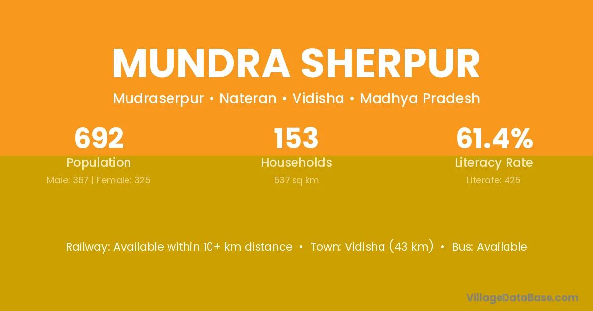 Vidisha (43 km) is the nearest town to Mundra Sherpur village for major economic activities and is located approximately 43 km away.