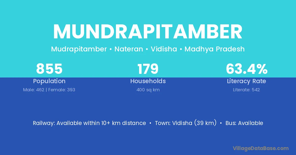 Vidisha (39 km) is the nearest town to Mundrapitamber village for major economic activities and is located approximately 39 km away.