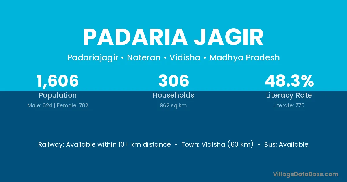 Vidisha (60 km) is the nearest town to Padaria Jagir village for major economic activities and is located approximately 60 km away.