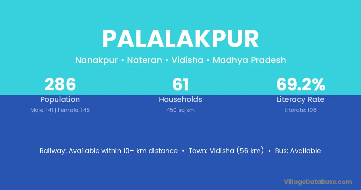Vidisha (56 km) is the nearest town to Palalakpur village for major economic activities and is located approximately 56 km away.