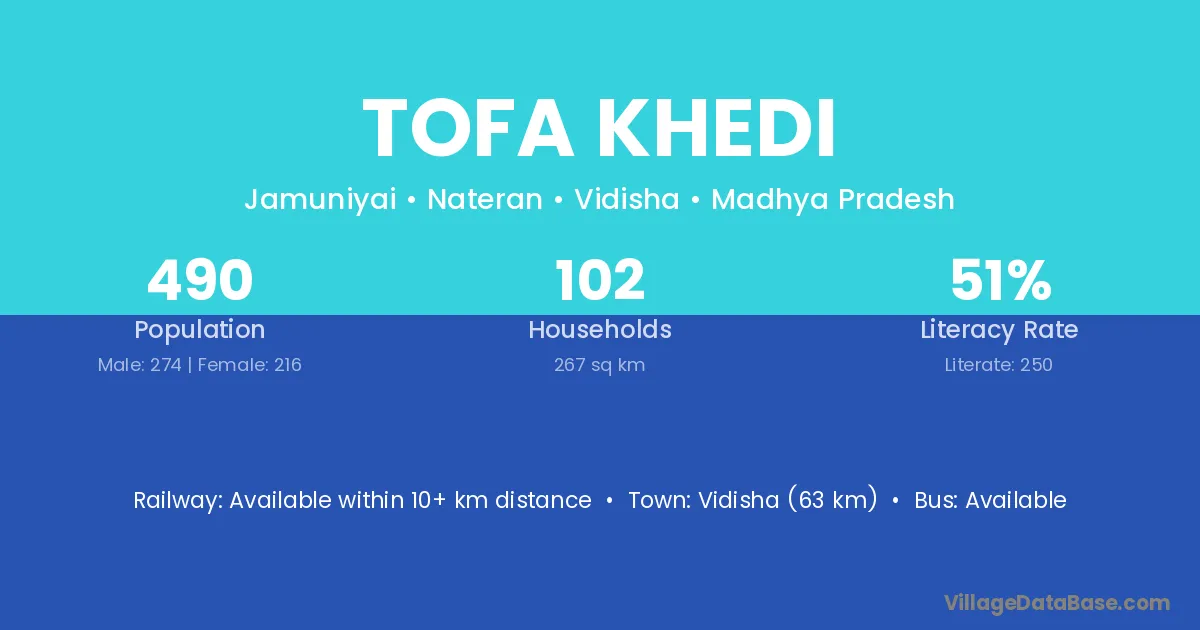 Vidisha (63 km) is the nearest town to Tofa Khedi village for major economic activities and is located approximately 63 km away.