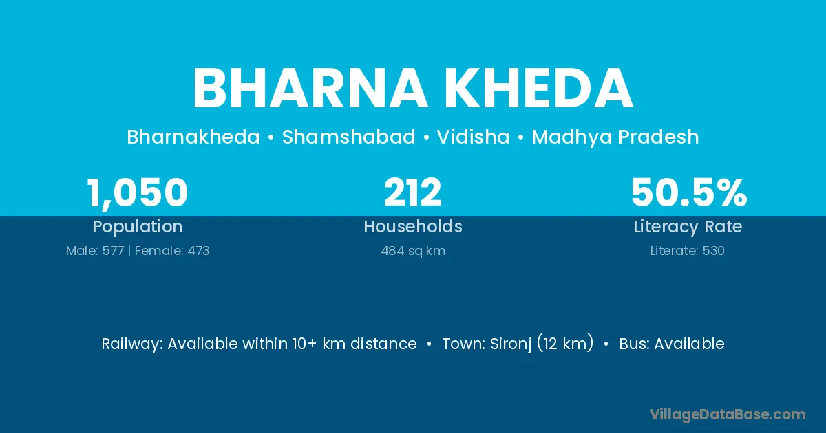 Sironj (12 km) is the nearest town to Bharna Kheda village for major economic activities and is located approximately 12 km away.