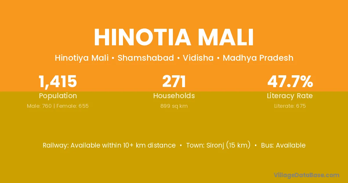 Sironj (15 km) is the nearest town to Hinotia Mali village for major economic activities and is located approximately 15 km away.