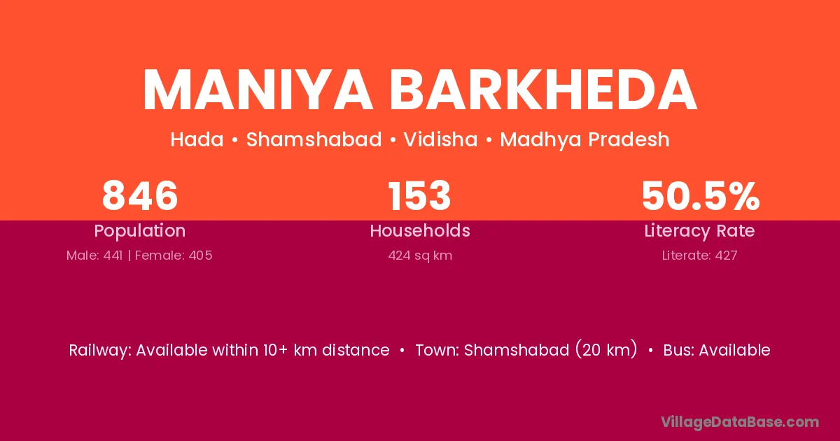 Shamshabad (20 km) is the nearest town to Maniya Barkheda village for major economic activities and is located approximately 20 km away.