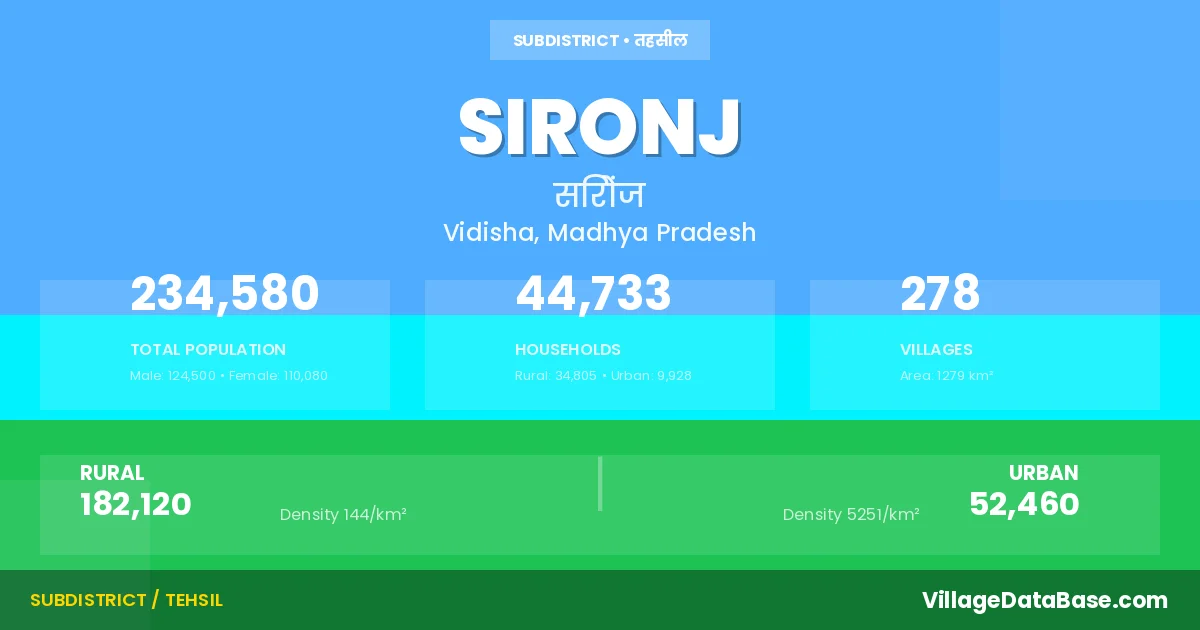 According to the 2011 census The total area of Sironj Tehsil is 1279 km², with a population of 234580 people. The population density is 183 inhabitants per square kilometre, and there are approximately 44733 houses in the sub district.