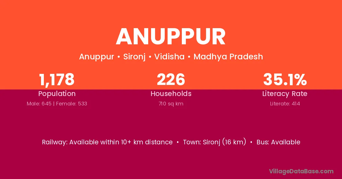 Sironj (16 km) is the nearest town to Anuppur village for major economic activities and is located approximately 16 km away.