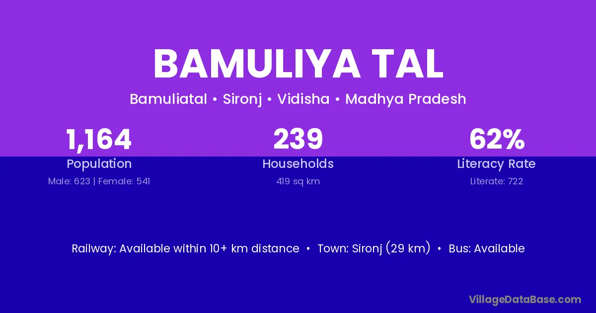Sironj (29 km) is the nearest town to Bamuliya Tal village for major economic activities and is located approximately 29 km away.