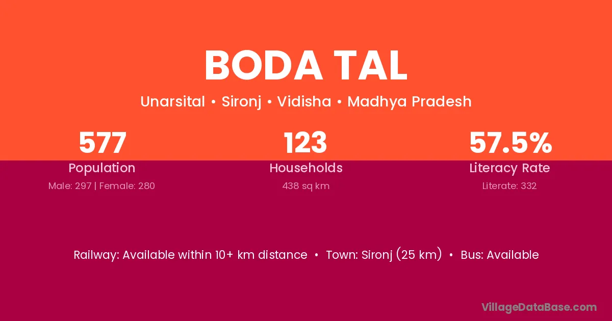 Sironj (25 km) is the nearest town to Boda Tal village for major economic activities and is located approximately 25 km away.