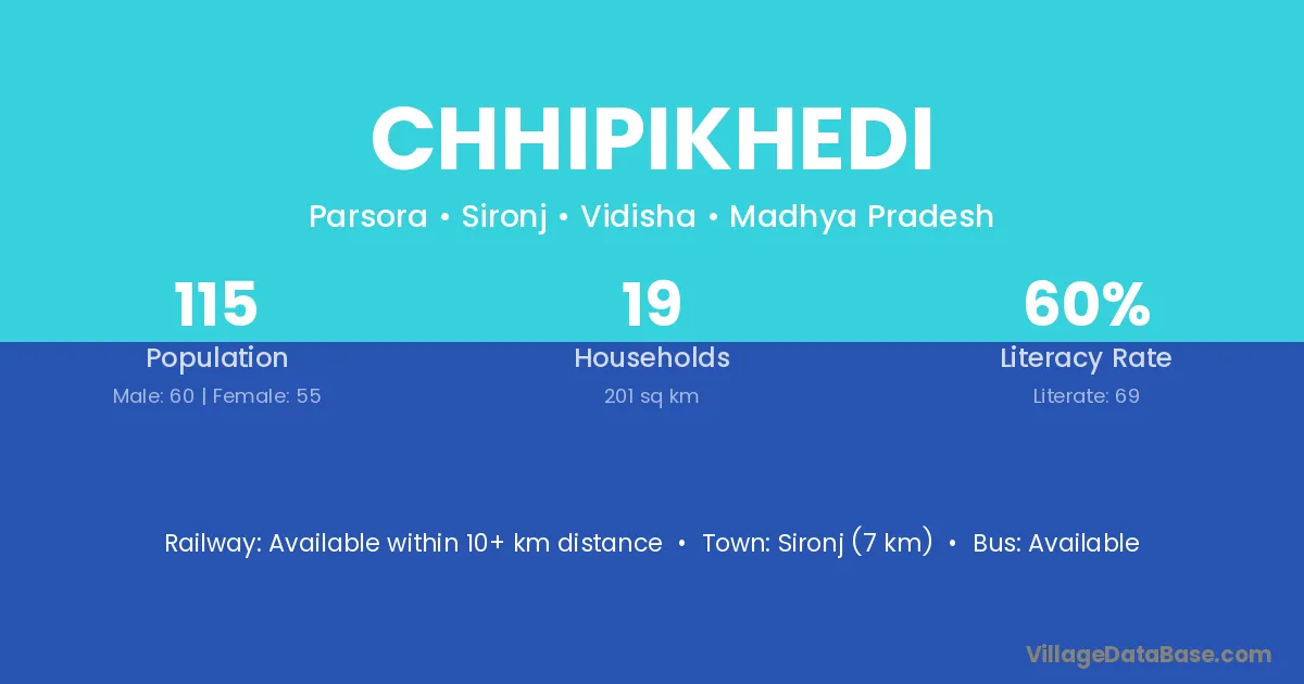 Chhipikhedi village has a total population of 115 people, of which 60 are males and 55 are females.