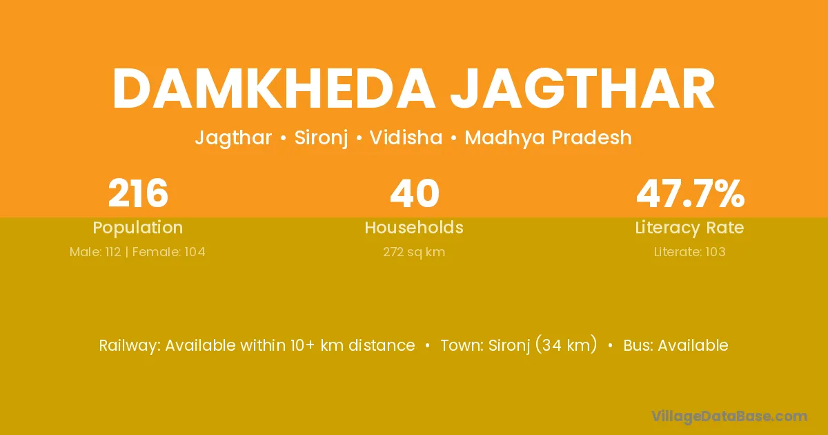 Sironj (34 km) is the nearest town to Damkheda Jagthar village for major economic activities and is located approximately 34 km away.