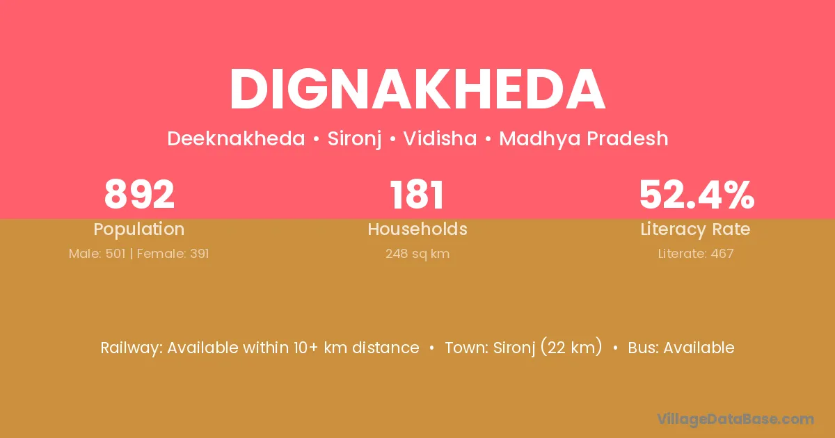 Sironj (22 km) is the nearest town to Dignakheda village for major economic activities and is located approximately 22 km away.