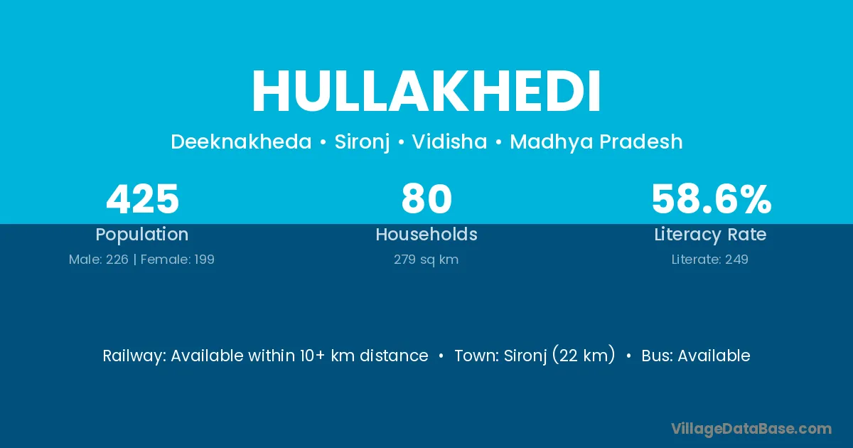 Sironj (22 km) is the nearest town to Hullakhedi village for major economic activities and is located approximately 22 km away.