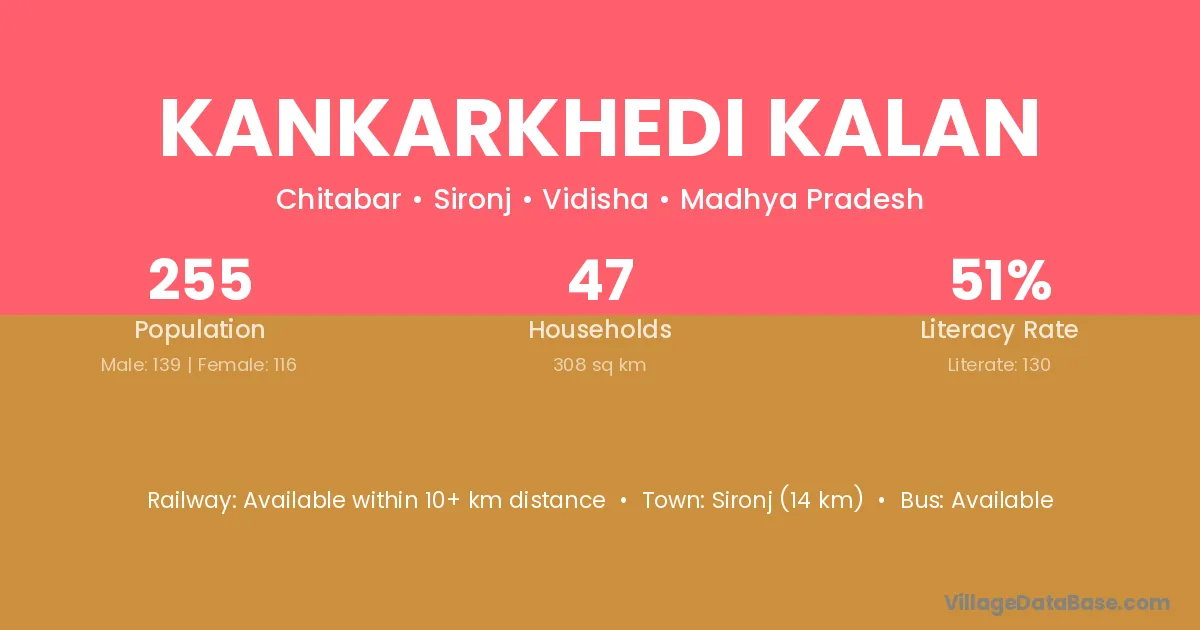 Sironj (14 km) is the nearest town to Kankarkhedi Kalan village for major economic activities and is located approximately 14 km away.