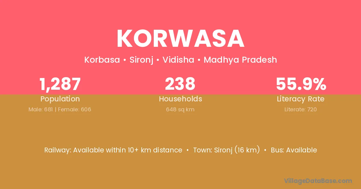 Sironj (16 km) is the nearest town to Korwasa village for major economic activities and is located approximately 16 km away.