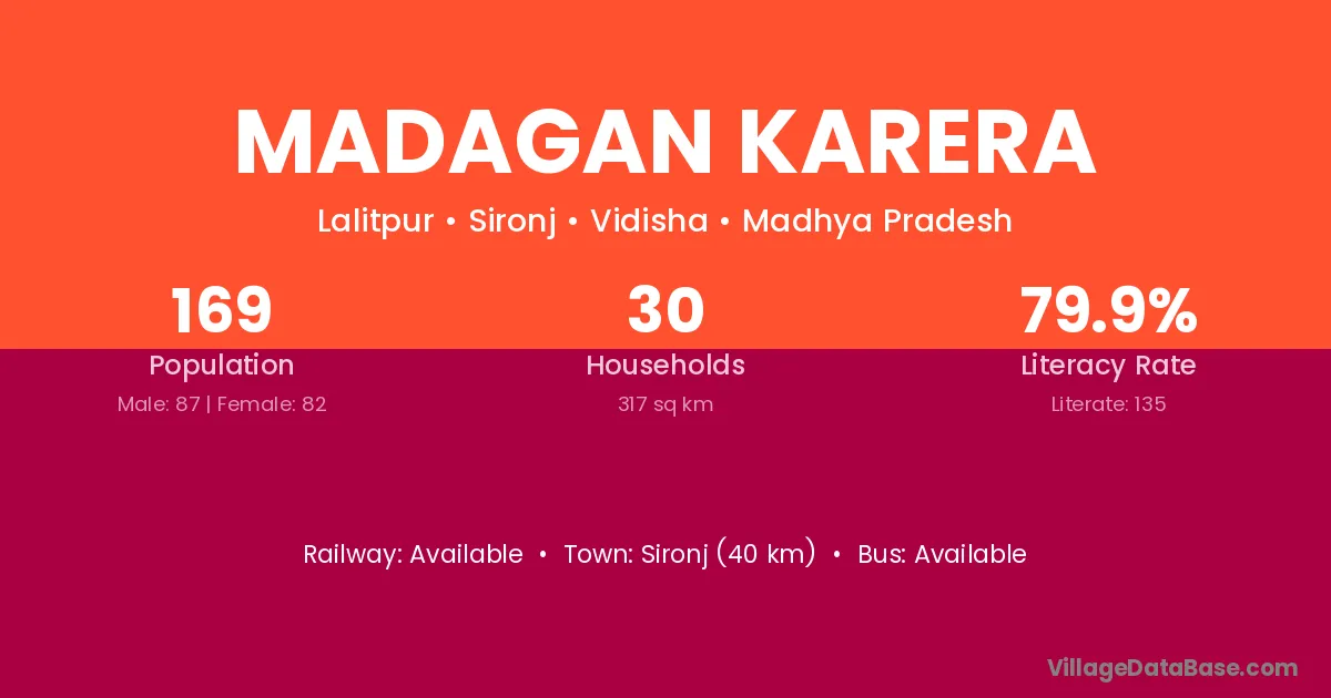Sironj (40 km) is the nearest town to Madagan Karera village for major economic activities and is located approximately 40 km away.