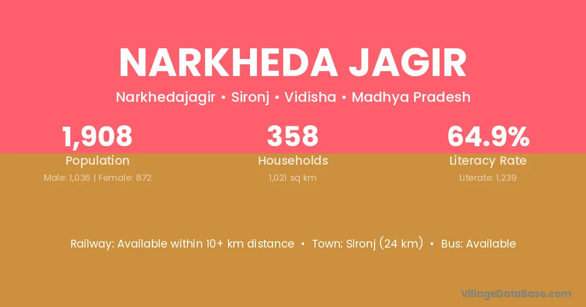 Sironj (24 km) is the nearest town to Narkheda Jagir village for major economic activities and is located approximately 24 km away.