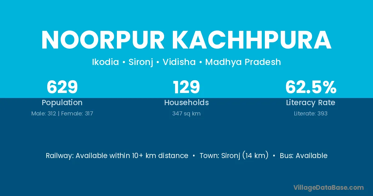 Sironj (14 km) is the nearest town to Noorpur Kachhpura village for major economic activities and is located approximately 14 km away.