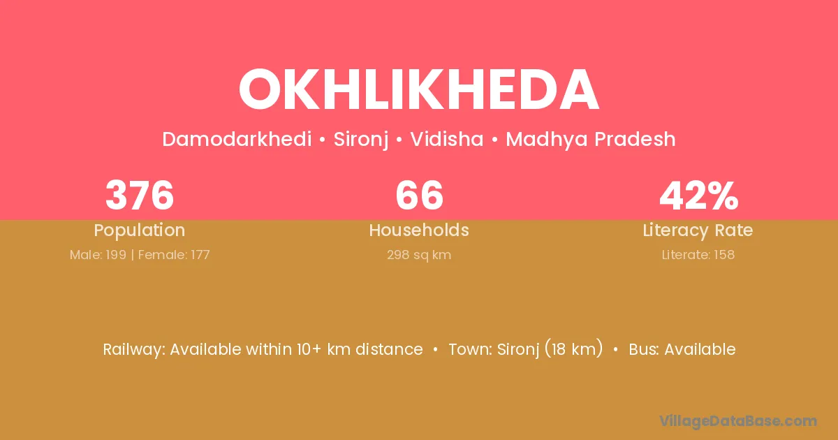 Sironj (18 km) is the nearest town to Okhlikheda village for major economic activities and is located approximately 18 km away.