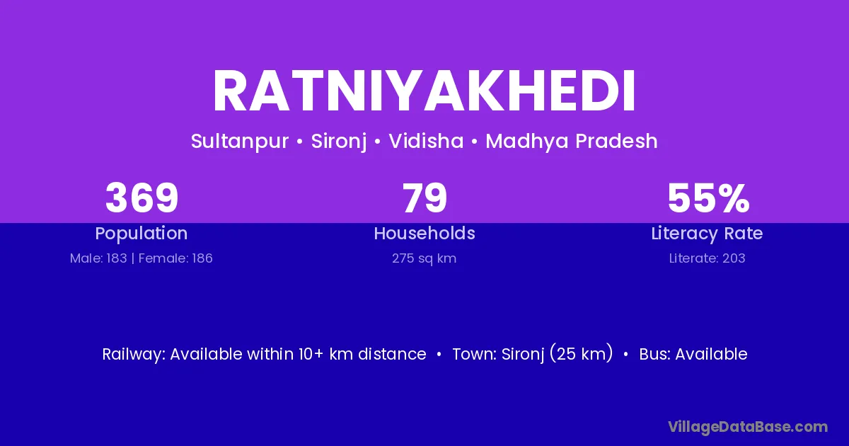 Sironj (25 km) is the nearest town to Ratniyakhedi village for major economic activities and is located approximately 25 km away.