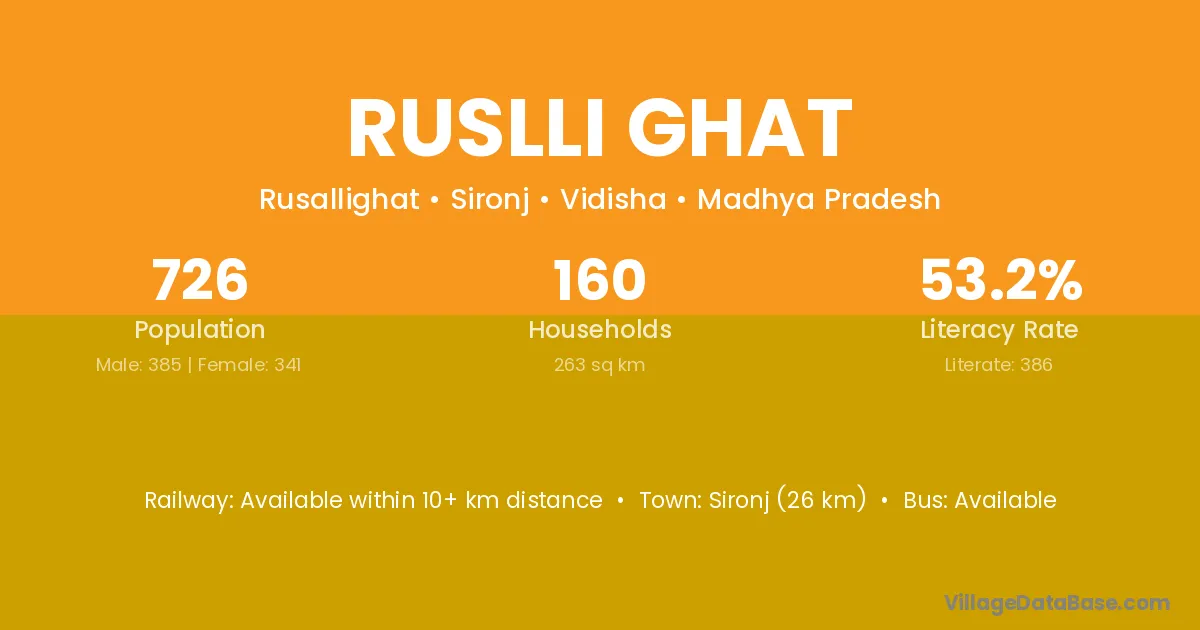 Sironj (26 km) is the nearest town to Ruslli Ghat village for major economic activities and is located approximately 26 km away.