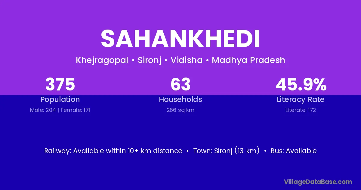 Sironj (13 km) is the nearest town to Sahankhedi village for major economic activities and is located approximately 13 km away.