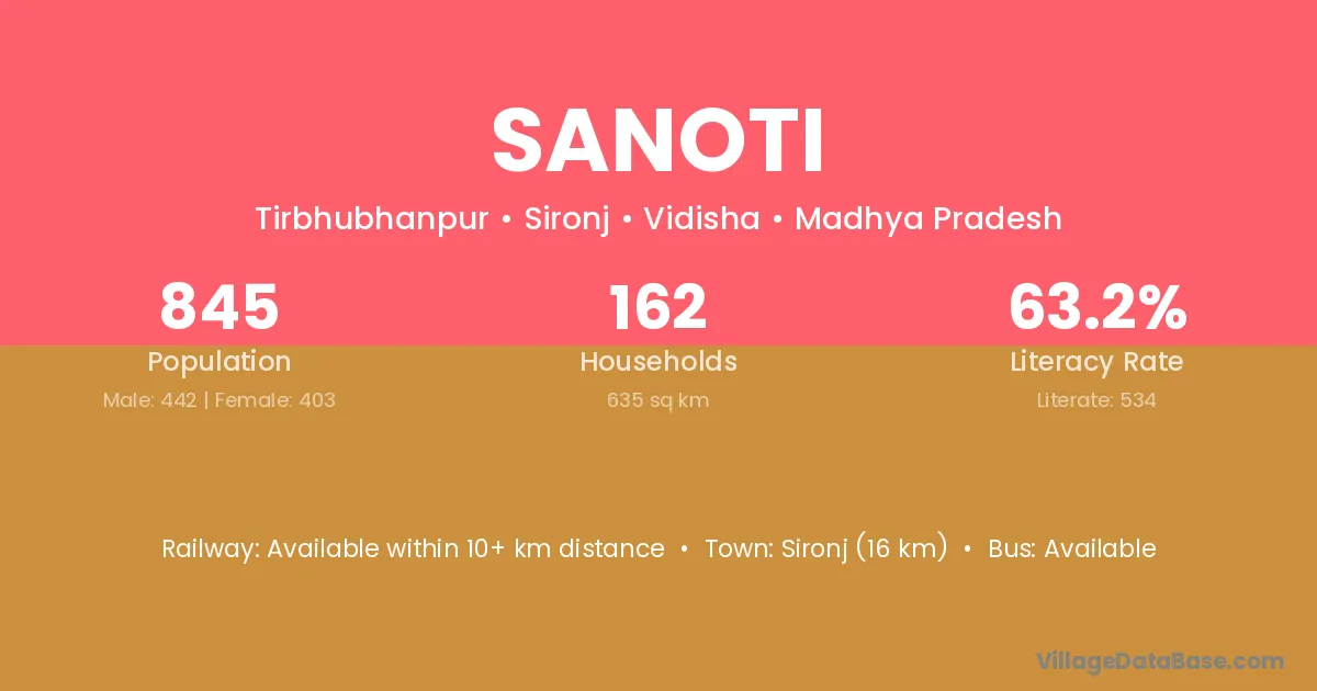 Sironj (16 km) is the nearest town to Sanoti village for major economic activities and is located approximately 16 km away.