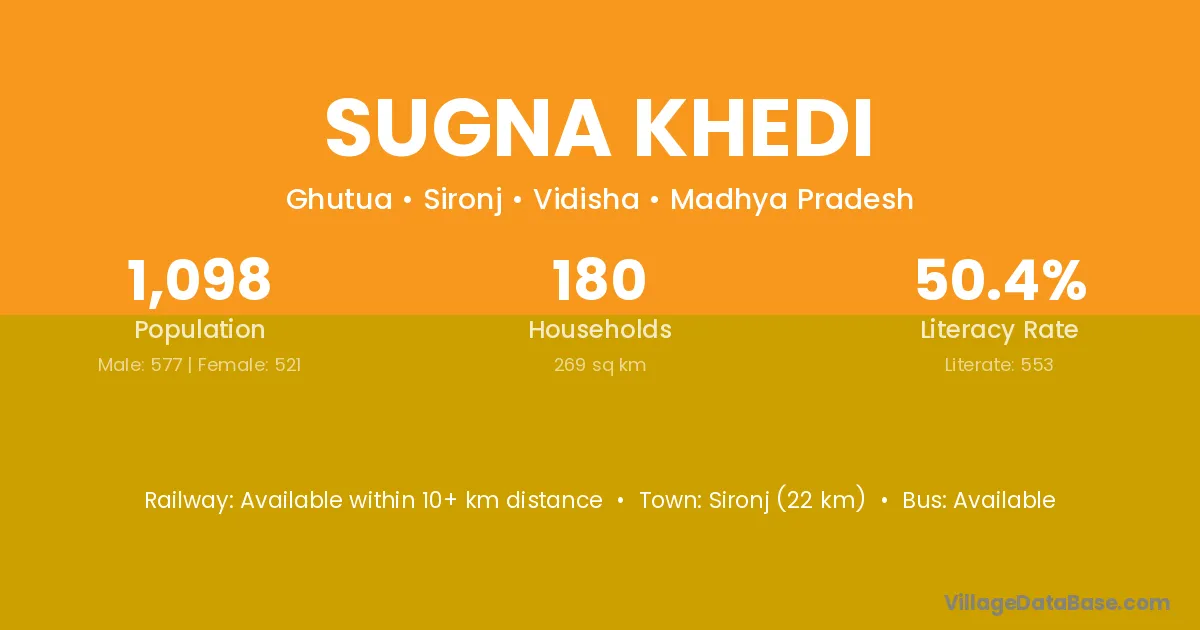 Sironj (22 km) is the nearest town to Sugna Khedi village for major economic activities and is located approximately 22 km away.