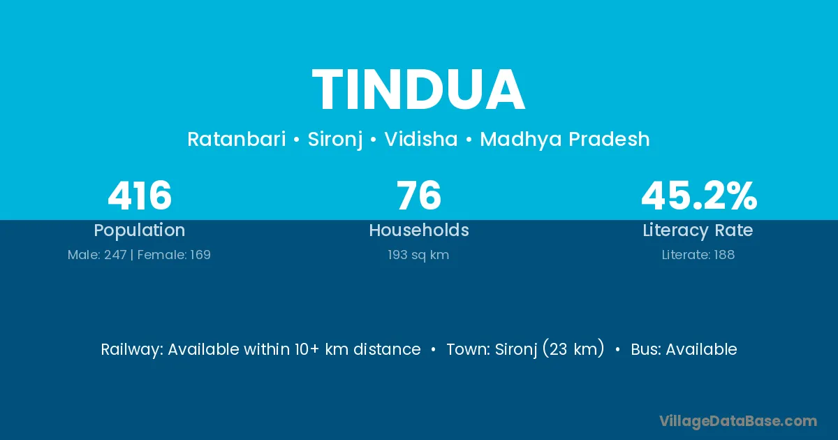 Sironj (23 km) is the nearest town to Tindua village for major economic activities and is located approximately 23 km away.