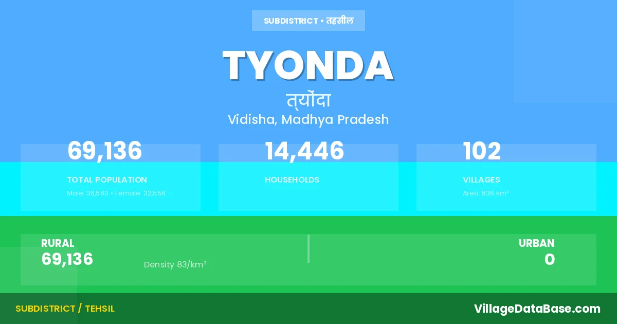 Tyonda is a town and Tehsil in the Vidisha district of the Madhya Pradesh. In India, a Tehsil is a subdivision of a district responsible for the administration and revenue collection of a specific area within the district. Tehsils play a crucial role in the local governance structure, contributing significantly to the development and administration of their communities.