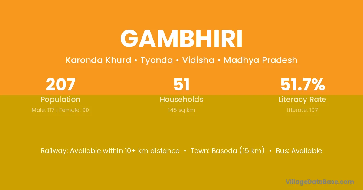 Basoda (15 km) is the nearest town to Gambhiri village for major economic activities and is located approximately 15 km away.
