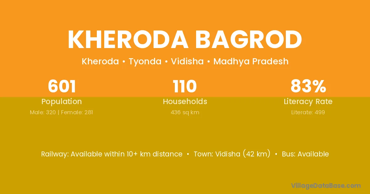 Vidisha (42 km) is the nearest town to Kheroda Bagrod village for major economic activities and is located approximately 42 km away.