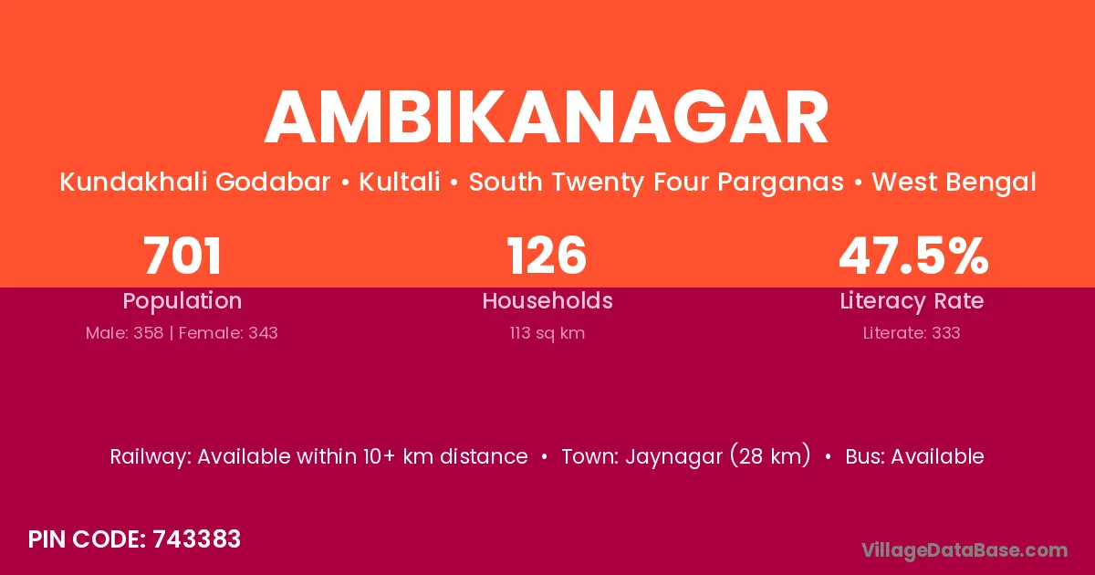 The literacy rate of Ambikanagar village is 60.62%. Male literacy stands at 70.44% and female literacy at 51.07%.