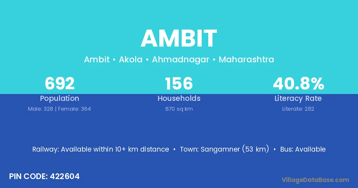 Sangamner (53 km) is the nearest town to Ambit village for major economic activities and is located approximately 53 km away.
