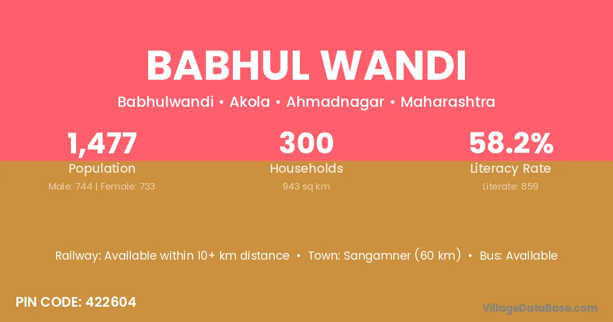 Sangamner (60 km) is the nearest town to Babhul Wandi village for major economic activities and is located approximately 60 km away.