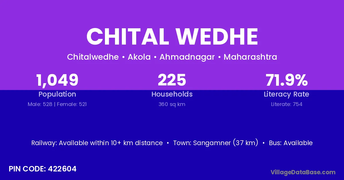 Sangamner (37 km) is the nearest town to Chital Wedhe village for major economic activities and is located approximately 37 km away.