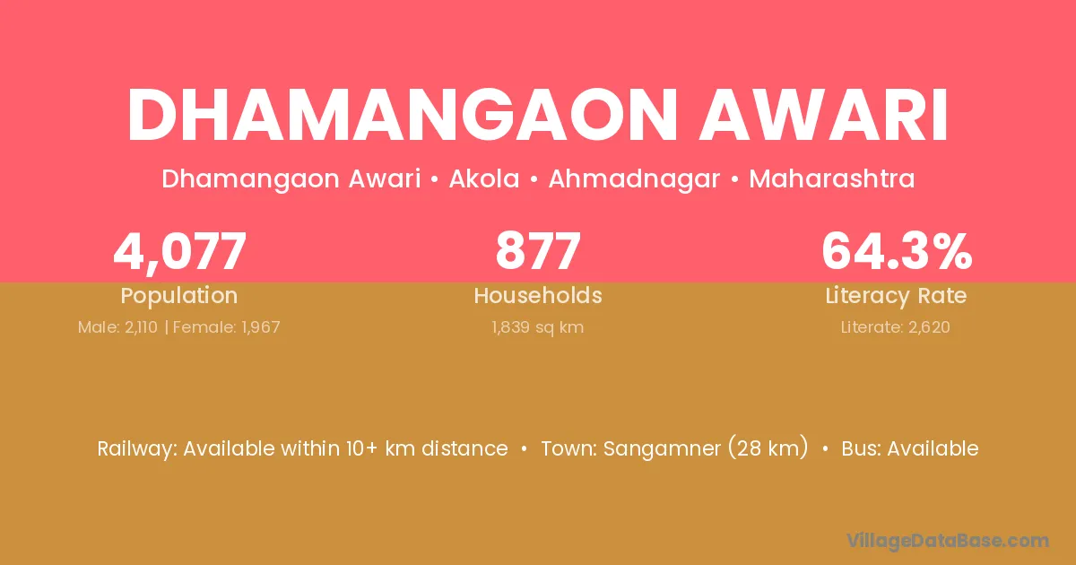 Sangamner (28 km) is the nearest town to Dhamangaon Awari village for major economic activities and is located approximately 28 km away.