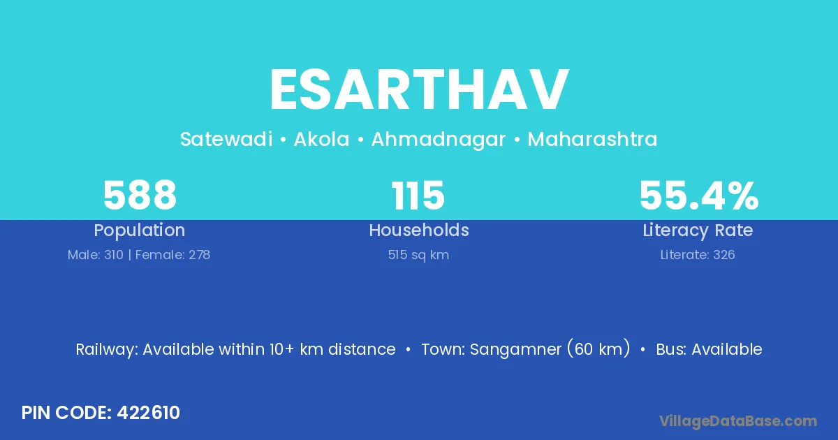 Sangamner (60 km) is the nearest town to Esarthav village for major economic activities and is located approximately 60 km away.