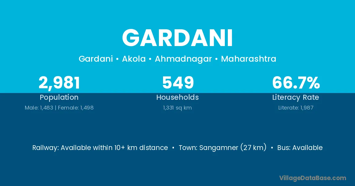 Sangamner (27 km) is the nearest town to Gardani village for major economic activities and is located approximately 27 km away.