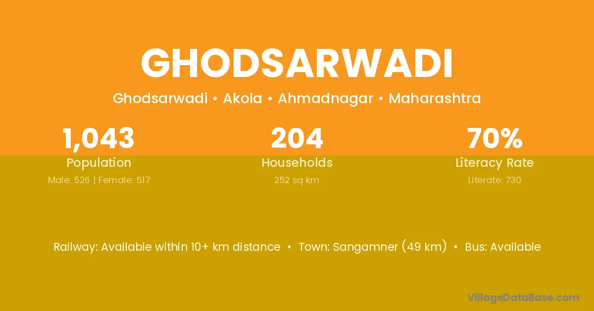 Sangamner (49 km) is the nearest town to Ghodsarwadi village for major economic activities and is located approximately 49 km away.