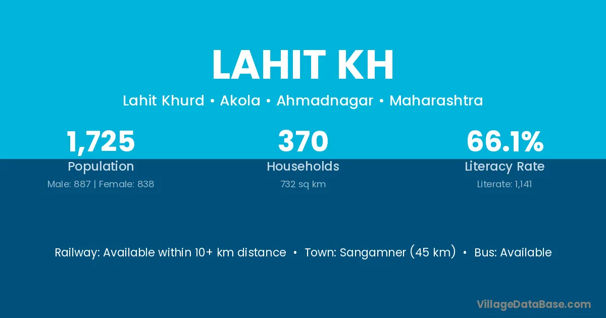 Sangamner (45 km) is the nearest town to Lahit Kh village for major economic activities and is located approximately 45 km away.
