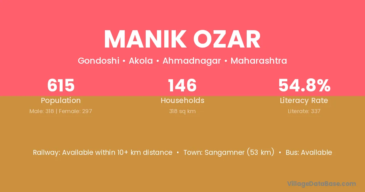 Sangamner (53 km) is the nearest town to Manik Ozar village for major economic activities and is located approximately 53 km away.