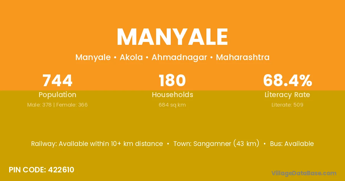 Sangamner (43 km) is the nearest town to Manyale village for major economic activities and is located approximately 43 km away.